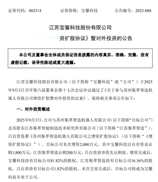 公告显示,宝馨科技与苏州集萃智造机器人及其股东江苏集萃智能制造技术研究所有限公司(简称“江苏集萃智造”)、吕自贵签署《增资扩股协议》。目标公司本次增资2000万元,其中宝馨科技以自有资金认购1800万元,增资完成后,宝馨科技持有目标公司81.82%的股权。